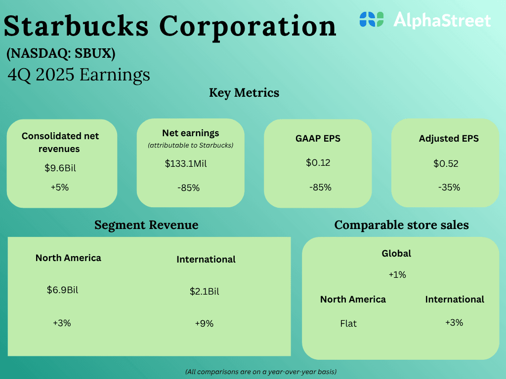 Within the fourth quarter of 2025, Starbucks’ consolidated internet revenues elevated 5% YoY to $9.6 billion. International comparable retailer gross sales elevated 1%. On an adjusted foundation, earnings per share decreased 35% to $0.52.